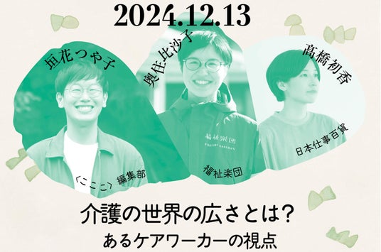 2024年12月13日(金)に開催される『ケアするしごとバー』第2回のゲストは、社会福祉法人福祉楽団の奥住 比沙子(おくずみ・ひさこ)さん。聞き手は<こここ>編集部垣花つや子、日本仕事百貨高橋初香が務めます。